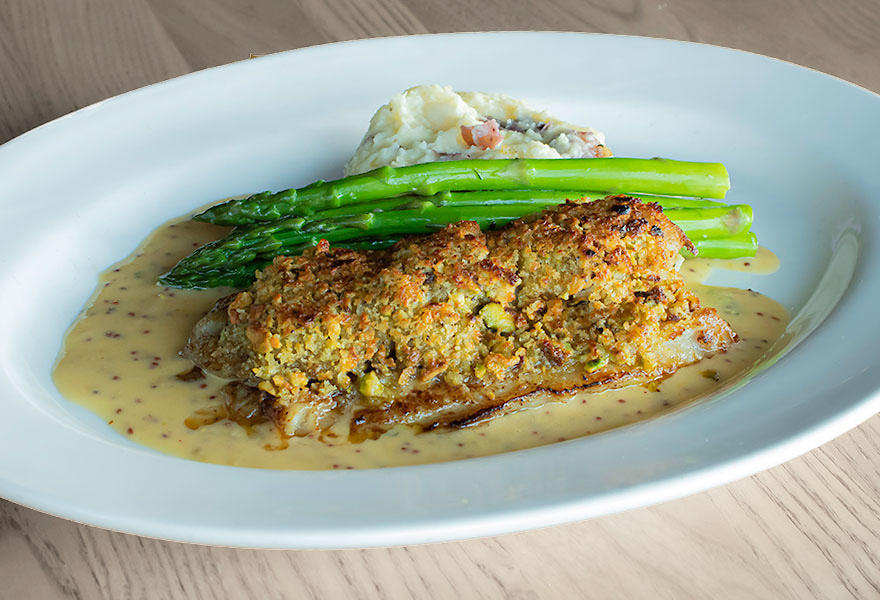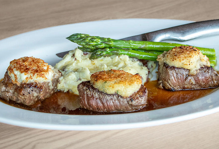 Horseradish, Bleu Cheese, and Parmesan-Crusted Filet Medallions, Mary’s Potatoes, Asparagus