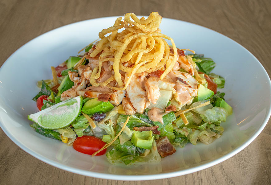 Sweet BBQ-Glazed Chicken, Romaine, Grape Tomatoes, Aged White Cheddar, Avocado, Sweet Corn, Black Beans, Cilantro, Tortilla Strips, Applewood Smoked Bacon, Crispy Onion Strings, Chipotle BBQ Ranch
