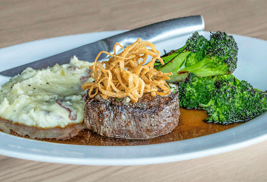 8 oz. Filet, Steak Butter, Crispy Onion Strings, Grilled Broccoli, Choice of Side