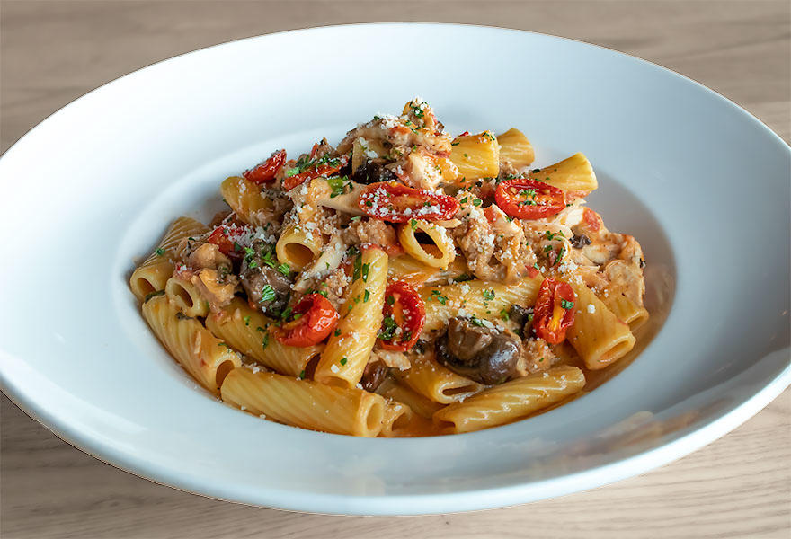 Italian Sausage, Mushroom, Chicken, Roasted Grape Tomatoes, Herbs, Tomato Garlic Cream Sauce