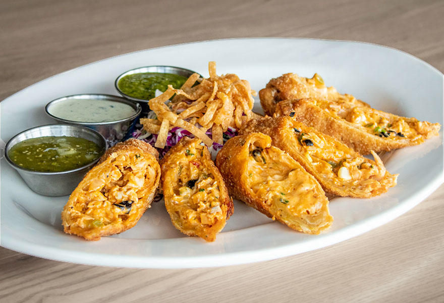 House-Made with Southwest Chicken, Corn, Black Beans, Cilantro, and Cheese; Tomatillo Salsa, Cilantro Ranch, and Cashew Dipping Sauces